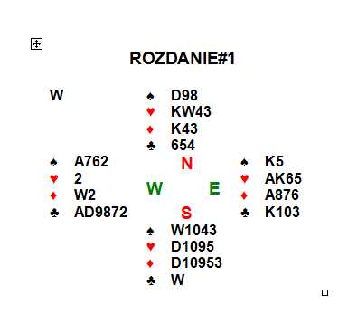 Bijemy asem karo, następnie pika do asa i dwa razy kiery, nawet jak podzielą się 3 – 1, gramy króla i damę pik i wyrzucamy dwa kara, nawet jak dzielą się 4 – 2, tak jak w rzeczywistości, oddamy dwa trefle i ewentualnie kiera, gdy się nie dzielą. Ale jak wygrać 13 lew, gdy karty ułożą się tak jak na diagramie. Jeśli potrafisz, napisz jak będziesz rozgrywał(a).